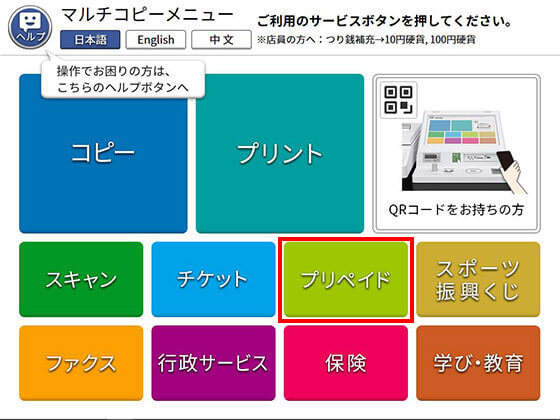 メニュー画面にて、「プリペイド」ボタンをタッチ