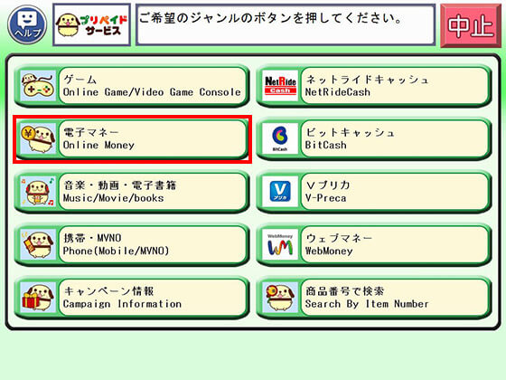 ジャンル選択画面にて、「電子マネー」ボタンをタッチ