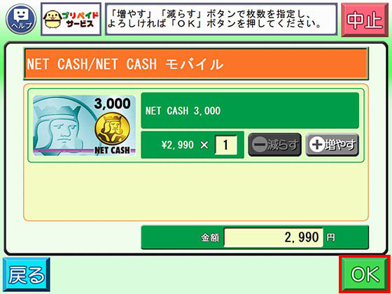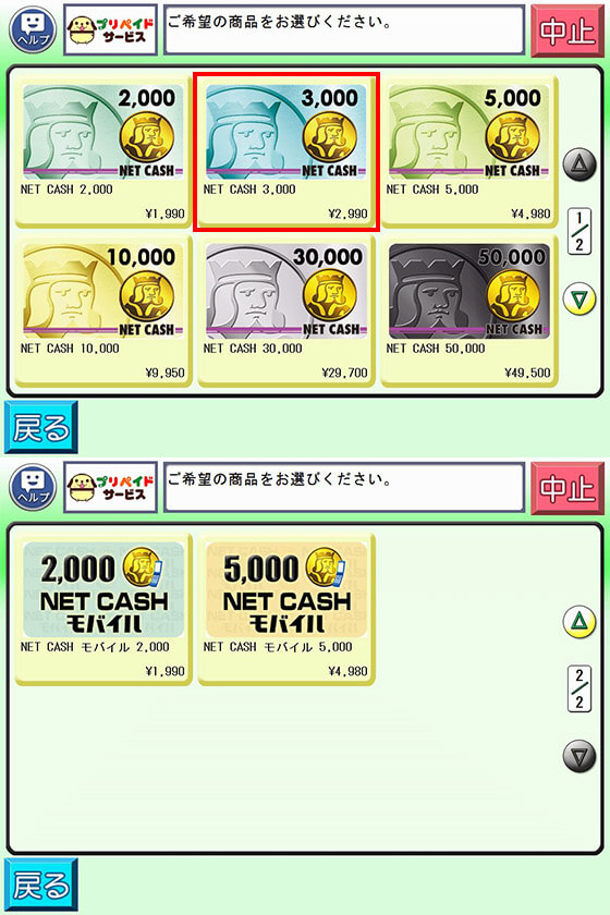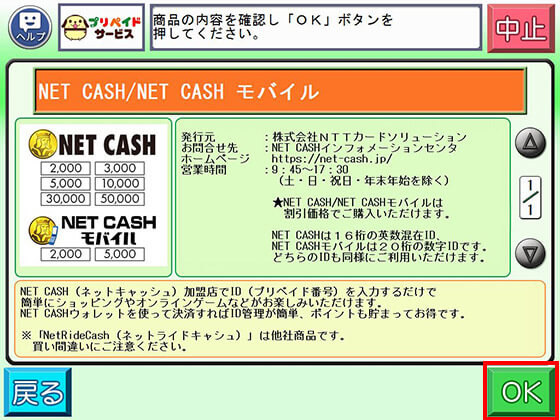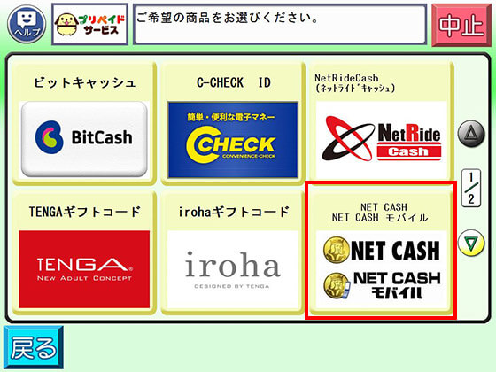 商品選択画面にて、「NET CASH/NET CASHモバイル」ボタンをタッチ