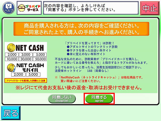 同意確認画面にて、支払い後の返品不可等、注意事項をご確認後、「同意する」ボタンをタッチ