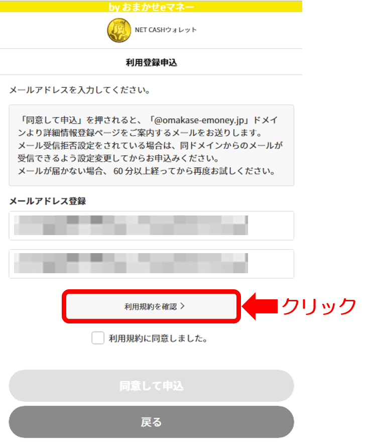 利用登録申込画面でご登録メールアドレスを入力し、【利用規約を確認】をクリック