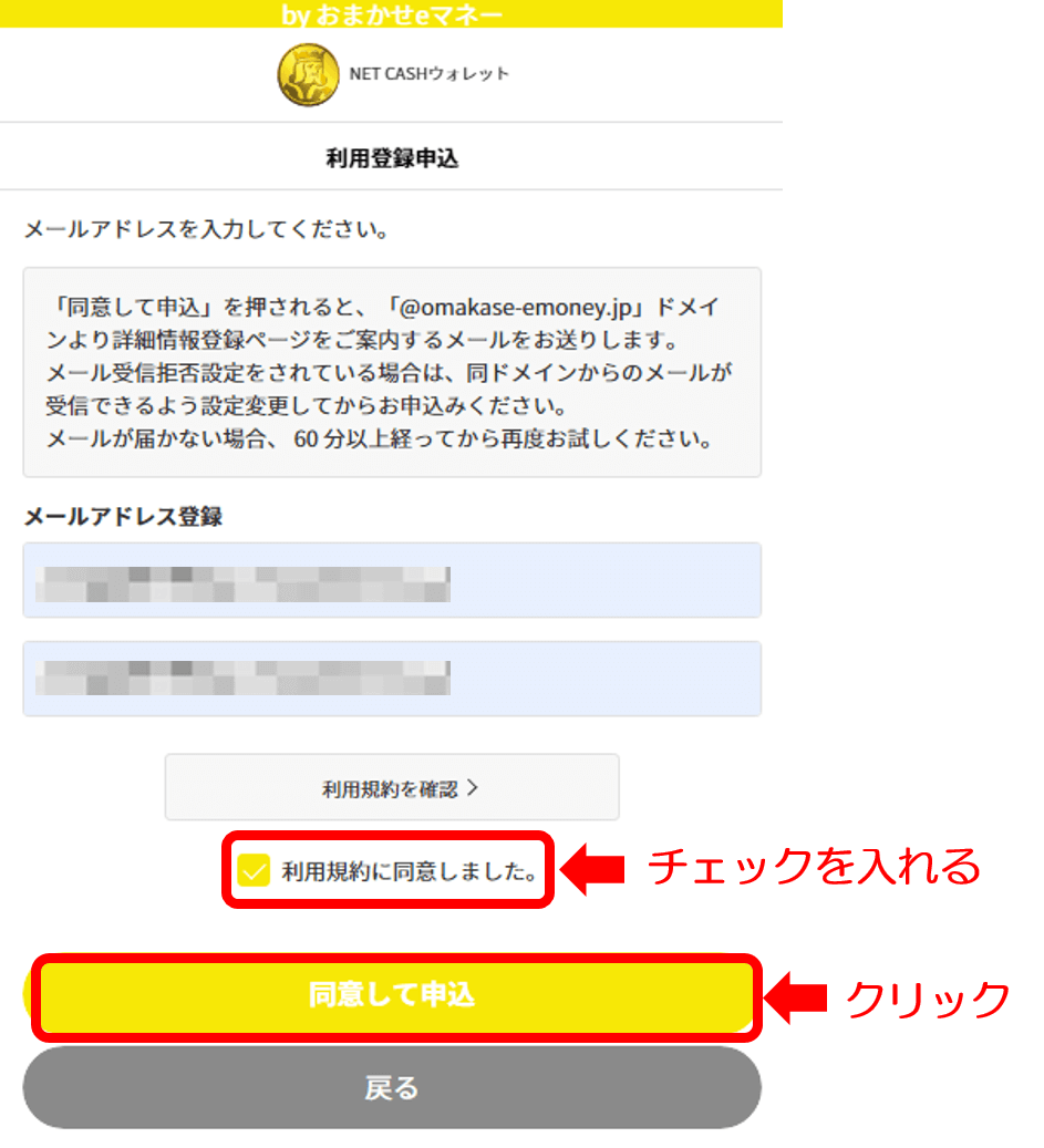 利用規約書の画面を閉じたら“利用規約に同意しました”のチェックボックスにチェックして【同意して申込】をクリック