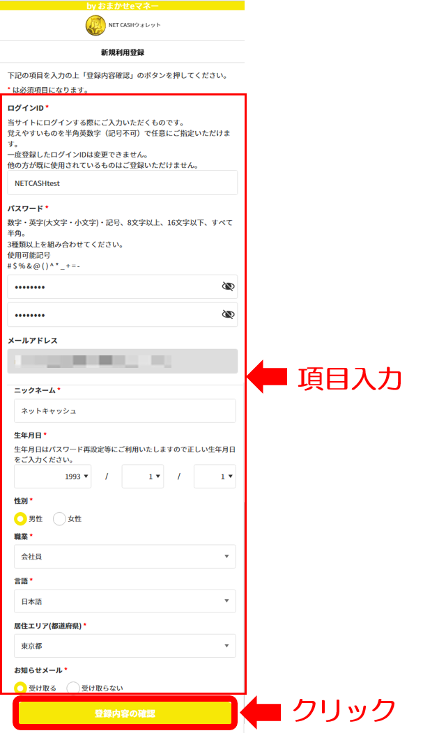 必要項目をすべて入力し【登録内容の確認】をクリック